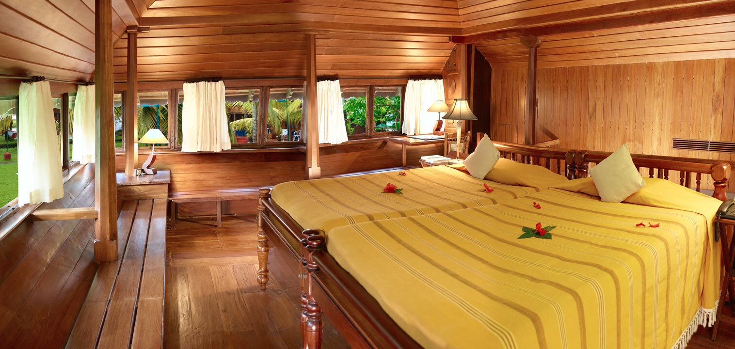 An interplay of coconut groves and backwater canals, with old wooden Keralan homes transplanted, preserved, and cherished.