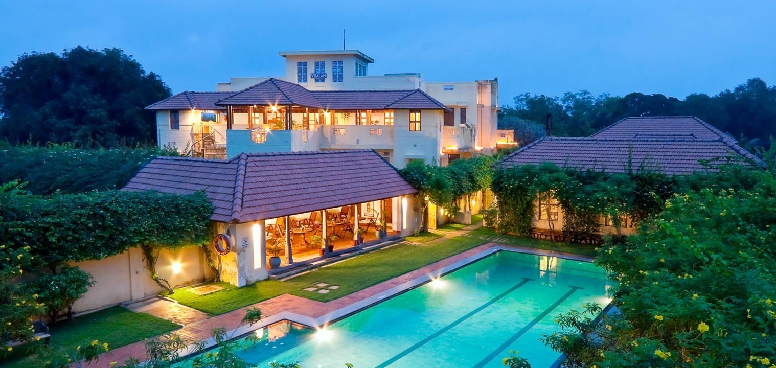Visalam is a beautiful heritage mansion delightfully converted into a boutique hotel in Chettinad. Each of the 15 heritage spacious guest rooms with modern conveniences is uniquely decorated with antiques, vintage photographs, and local textiles, and has large windows overlooking bougainvillea-brightened gardens.