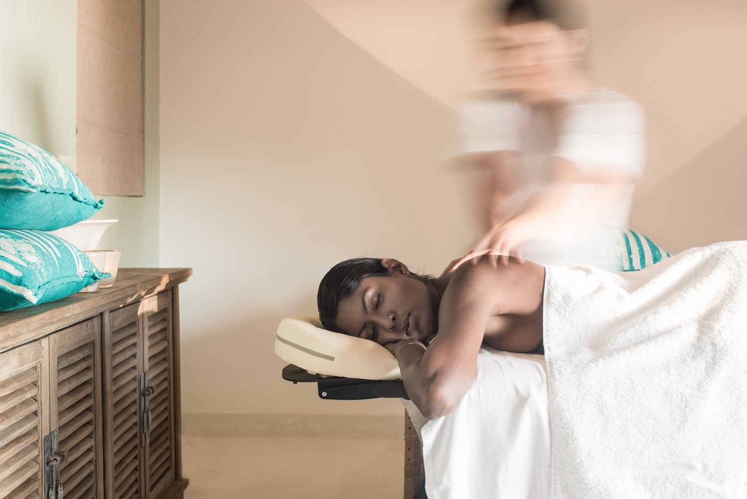 The accommodation sits beneath gently swaying coconut palms on a serene boulder-sprinkled seafront and powder-soft beach.