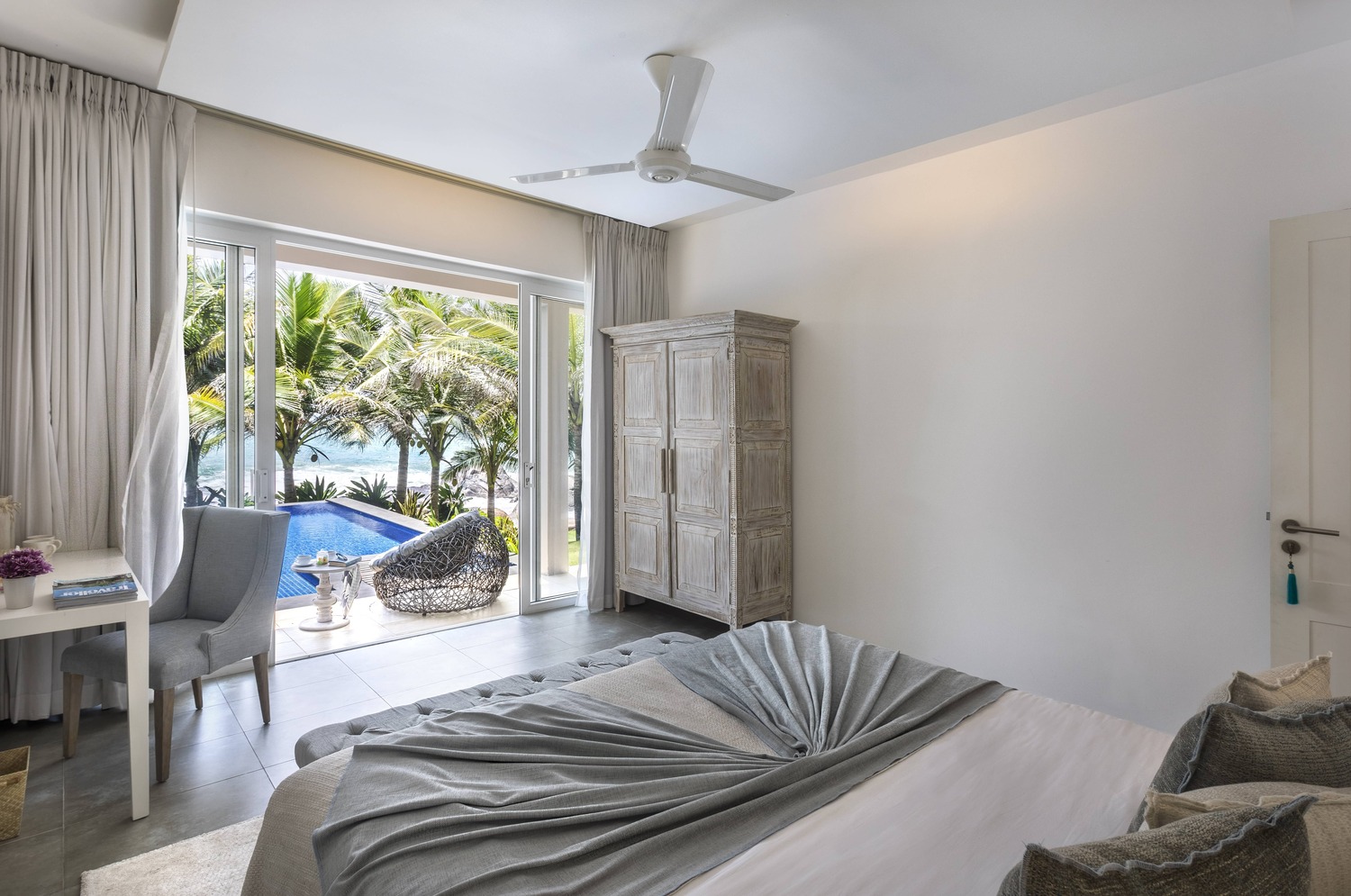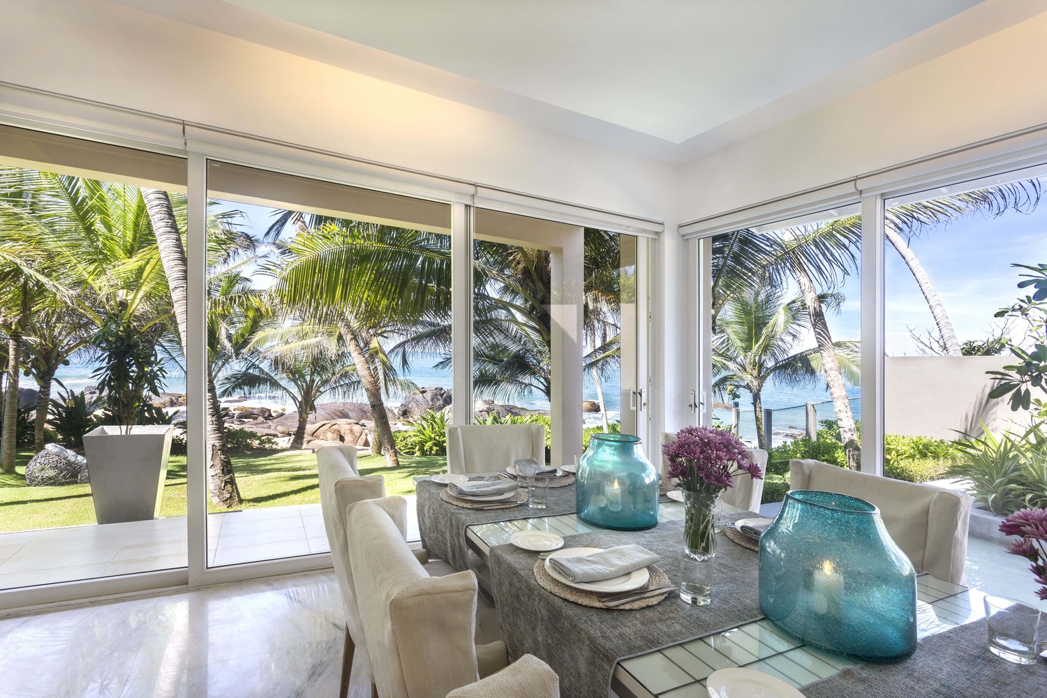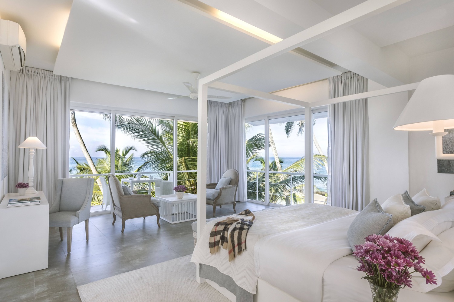 The Sandals is a light and airy beach villa with a Mediterranean feel edged by the turquoise seas. This two-story, tropical modern beach villa is designed with whitewashed walls and large glass windows that provide for uninterrupted sea views. Interiors are decorated with plush white sofas and contemporary local art.