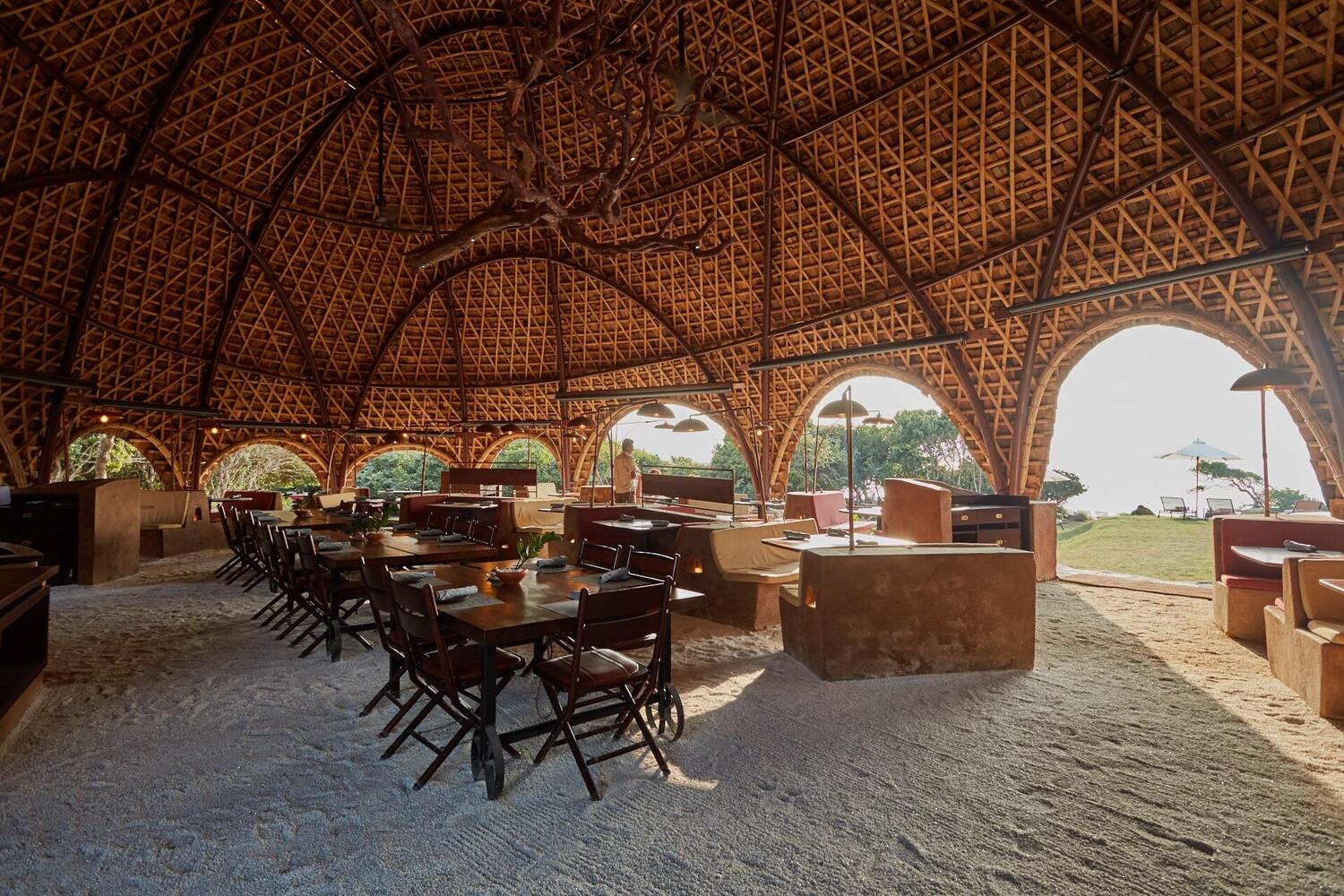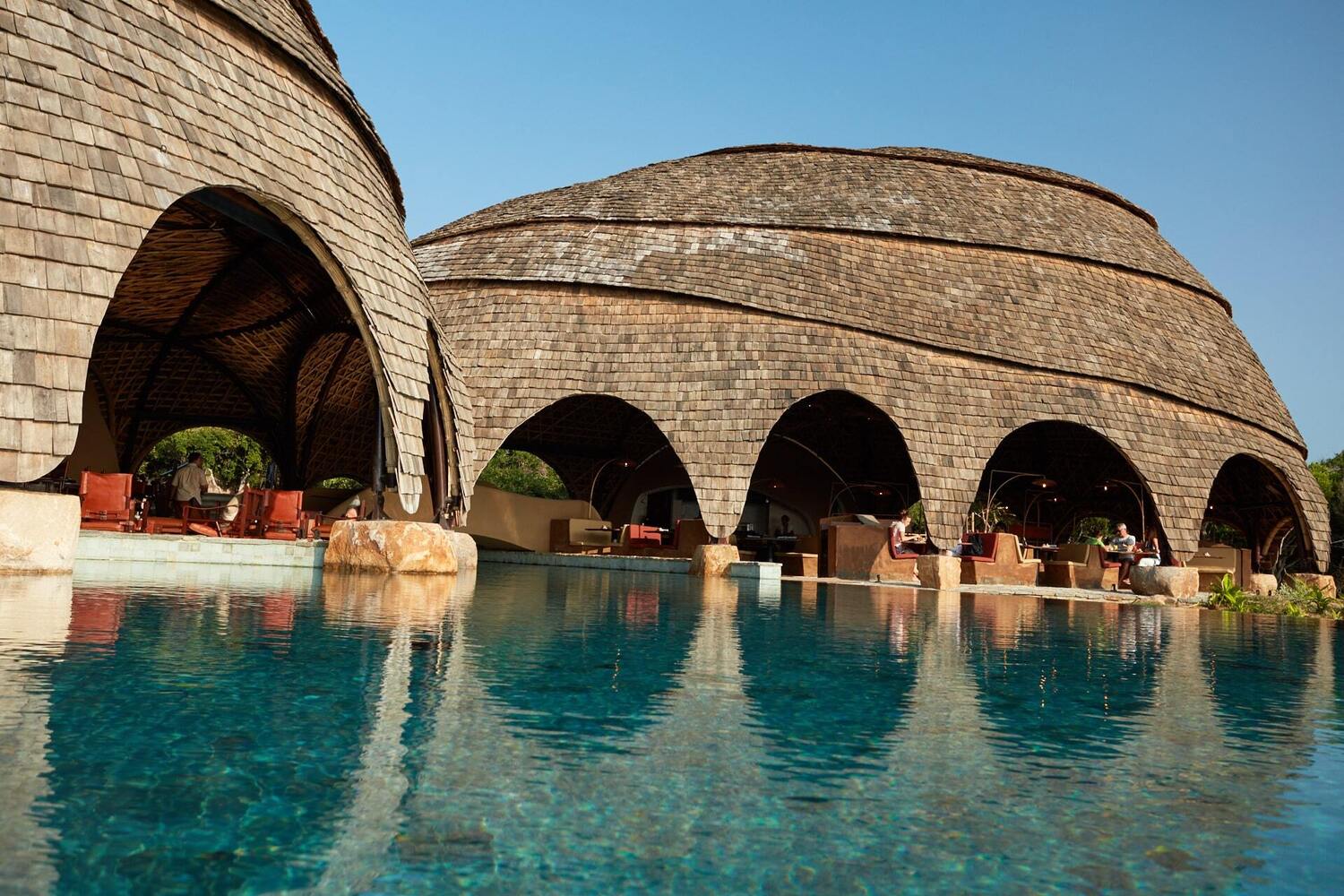 The open-air bamboo-clad Ten Tuskers bar and Dining Pavilion – designed to mirror the boulders scattered across the golden beach beyond – wrap around the resort’s enormous free-form swimming pool.
