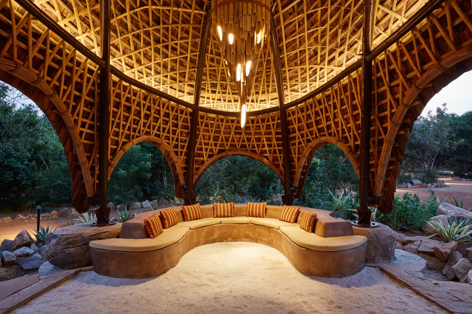 A spectacular luxury tented camp, between jungle and the Indian Ocean, with 28 Cocoon pods in canvas & teak with copper detailing, some with plunge pools. The vaulted bamboo restaurant and bar overlook a large freeform pool and rugged beach where sunset drinks are held.